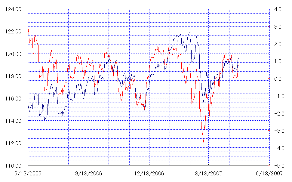 (赤:乖離率 青:終値)