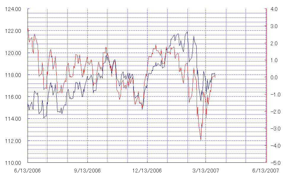 (赤:乖離率 青:終値折れ線)