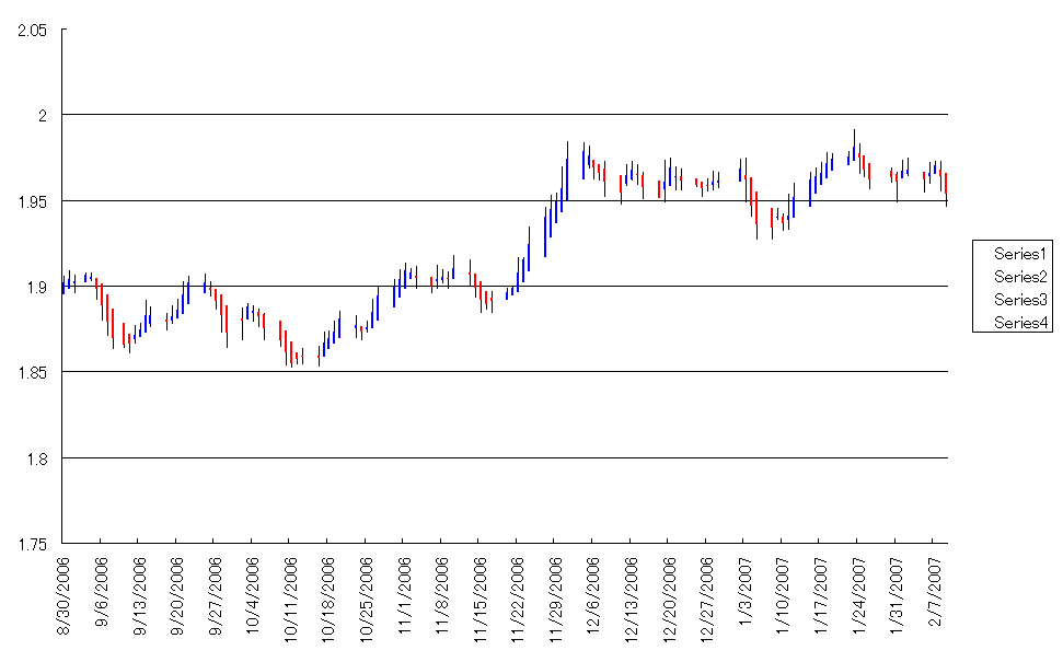日足チャートでは2/5の安値を割って次なる目標の1/31の安値&70日足移動平均を割って下がっていくかなぁと思いましたが、また1.9500付近へ戻ってきまして底堅い様子が感じられます。